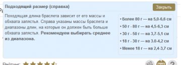 Відповідна довжина браслета залежить від його маси і обхвату зап'ястя. Справа вказані маси браслета і діапазони довжин, на які він повинен бути більше обхвату зап'ястя.																							- Більше 80 г - на 5,0-6,6 см