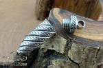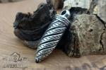 У верхній частині - масивний гвинтовий вузол: кільцеві проточки з чорнінням чергуються з гладкими кільцями, додаючи об'єму виробу. Вушко виконане як частина кришки, і служить отвором для розміщення більшого вушка для ланцюгів різної товщини.
