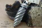 Корпус покритий діагональними витками, що нагадують закручені пір'я: кожна смуга має поглиблений контур із чорнінням і центральну прожилку, що створює виразний контраст полірованих граней та затемнених канавок. Орнамент поступово повторюється по всій довжині, формуючи динамічний спіральний малюнок.